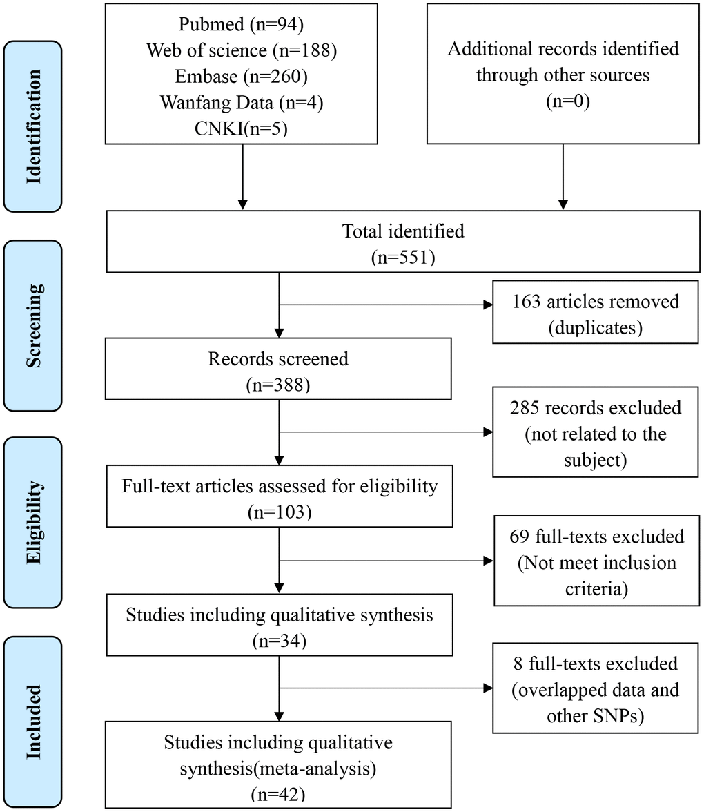 Two independent investigators respectively conducted a literature search according to the above search strategy, screened each article based on the predesigned inclusion and exclusion criteria, and extracted data from these eligible studies. It would be settled by discussion with the third party when the disagreement between investigators occurred. The following information was collected from every paper: 1) first author's surname, 2) the year of publication, 3) country or region of origin, 4) ethnicity, 5) total numbers of cases and controls, 6) genotype method, 7) diagnostic criteria, 8) polymorphism locus, 9) allele distribution or/and genotype distribution.