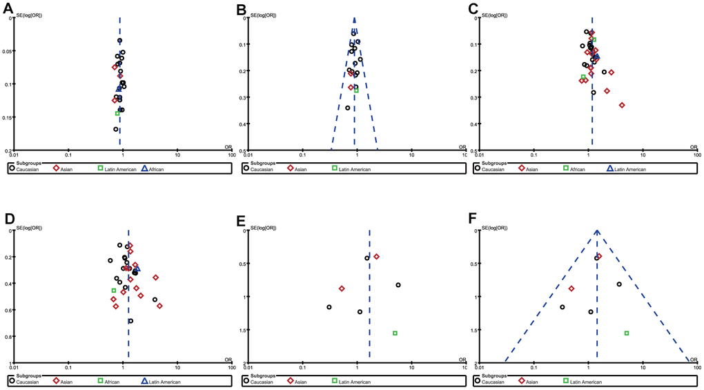 To ensure the reliability of the results, we first evaluate the heterogeneity (by I2) and found that heterogeneity existed in some genetic models of rs231775 SNP and rs5742909 SNP (Table 3). In order to minimize heterogeneity, the following methods were carried out in this meta-analysis. On the one hand, the random-effect models were exploited in the genetic models with moderate heterogeneity(I2>50%). On the other hand, sensitivity analysis was adopted to evaluate the effect of a single study on the pooled ORs by removing each study in turn from the pooled analysis. Although the heterogeneity had not changed obviously, the P values for pooled ORs under allelic comparison, heterozygous comparison and dominant comparison were reversed when the study [24] led by Elshazli R was removed. Therefore, we deleted this study and recalculated the relevant ORs and 95%CIs to harvest a stable and credible outcome (Figure 3). The funnel plots were used to investigate publication bias and the outlines of the funnel plots appear to be symmetrical (Figure 5). For rs231775 SNP, the asymmetry of the funnel plot was attributed to Zhou et al.’s study [45] which was published in Chinese. HWE estimation indicated that allele or genotype frequencies were deviant from HWE in control group in the Liu et al.’s, Gonzalez-Escribano et al.’s and Sameem et al.’s studies [25, 29, 38], but the results of synthesis analysis were not substantially inversed. Hence, we didn't remove these studies from the meta-analysis.
