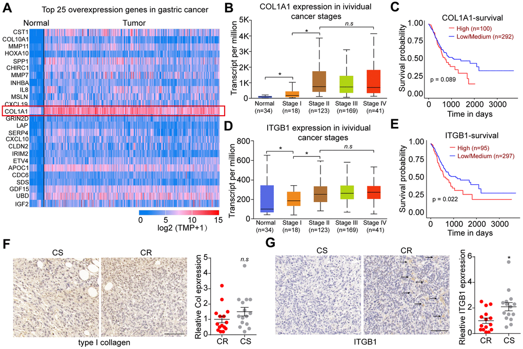 To explore the underlying mechanism of sustained tumor progression in gastric cancer, we first analyzed the TCGA database to comparing the top expression genes between gastric tumor tissues and normal tissues (Figure 1A). Notably, extremely high expression of COL1A1, which encodes type I collagen, was found in gastric cancer. To further confirm the pro-tumor effects of COL1A1 on gastric tumor progression, we used TCGA database to analyze the COL1A1 expression in gastric cancer patients with different stages and the overall survival. As shown in Figure 1B, elevated expression of COL1A1 was observed in gastric tumor tissues in high stage (stage II, III and IV) compared with normal tissues or tumor tissues in stage I (Figure 1B). However, no significant difference was found in overall survival of gastric cancer patients with high/low COL1A1 expression (Figure 1C), reminding us that COL1A1/type I collagen was not capable of regulating gastric tumor progression directly. Increasing evidence suggested that type I collagen could promote cancer stem cells proliferation and facilitate pro-survival signaling pathway activation through integrin receptors. Given the aberrant expression of COL1A1 in tumor tissues, we supposed that type I collagen might play a role through integrins signals in tumor development. ITGB1, belonging to the integrin family, has been demonstrated to bind to type I collagen and mediate the extracellular signals transduction [13, 14]. Intriguingly, using TCGA database analysis, elevated expression level of ITGB1 was found in gastric cancer tissues compared to normal tissues. Meanwhile, gastric cancer patients in high stage (stage II, III and IV) exhibited higher ITGB1 expression compared with patients in stage I (Figure 1D). More importantly, poor overall survival was observed in gastric cancer patients with high ITGB1 expression (Figure 1E). Subsequently, we further assessed the expression of type I collagen and ITGB1 in those chemo-resistant gastric tumor tissues. Consistently, no significant difference was observed in type I collagen expression between chemo-resistant (CR) and chemo-sensitive (CS) tumor tissues from gastric cancer patients (Figure 1F). As for ITGB1, elevated expression of ITGB1 was found in CR tumor tissues compared to CS group (Figure 1G). Together, those results suggested elevated expression of type I collagen and the positive correlation between ITGB1 and gastric cancer development.