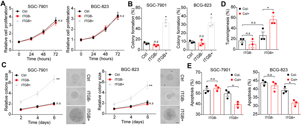 The cell proliferation of SGC-7901 and BGC-823 was performed using a MTT analysis kit (Solarbio, Beijing, China). Briefly, 3000 sorted tumor cells were seeded into the 96-well plates with 200 μl 1640 complete medium supplemented with 10% fetal calf serum. After 24, 48 and 72 hours, 5 μl MMT solution was added into the 96-well plated. After 2 hours of incubation, the culture medium was removed and 100 μl DMSO was added into the 96-wells. Absorbance was measured at 570 nm on a microplate reader (Bio-Rad, MA, USA). For the 3D colony formation assay, sorted tumor cells (~200 cells/well) were seeded in the 3D collagen gel. After 4 days, the cell colonies were imaged and counted. The colony sizes were calculated by image J 2.3 software. 50 colonies were pictured and the sizes were calculated in each group. Each experiment was performed three times, independently.