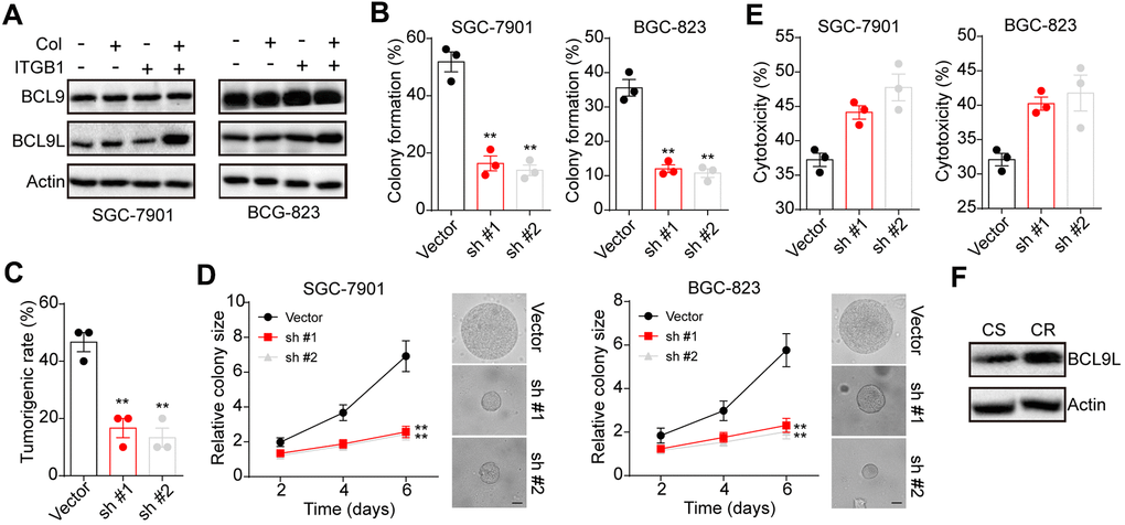 Next, we sought to investigate the underlying mechanism of ITGB1 associated gastric cancer progression and drugs resistance. BCL9 transcription coactivator has been reported to mediate pro-survival signaling pathways activation and correlated with lymphoma and leukemia development [15, 16]. Here, we further examined the expression of BCL9 in sorted ITGB+/- gastric cancer cells SGC-7901 and BGC-823(cultured in 3D collagen gel or not). No significant difference of BCL9 expression was observed in collagen cultured ITGB1 positive cells. However, upregulation of BCL9L, the paralog of BCL9 [17], was found in collagen cultured ITGB1 positive cells (Figure 3A). To further confirm the role of BCL9L in ITBG1 induced tumor progression, we silenced BCL9L in SGC-7901 and BGC-823 cells. As a result, blockade of BCL9L suppressed the 3D colony formation (Figure 3B) and tumorigenic capability (Figure 3C) of ITGB1 positive cells in 3D collagen gels. The colony growth of ITGB1 positive cells in 3D collagen gels was suppressed by BCL9L silencing (Figure 3D). Meanwhile, overexpression of BLC9L efficiently strengthened the colony formation capability of ITGB negative BGC-7901 and BGC-823 cells (Supplementary Figure 1A, 1B). Next, we further examined the association between BCL9L and drugs resistance in gastric cancer. Silencing BCL9L efficiently reversed the 5-FU resistance in collagen cultured ITGB1 positive cells (Figure 3E). Consistently, elevated expression of BCL9L was observed in tumor tissues from CR patients (Figure 3F). Together, those results suggested that BCL9L is in part relevant to the tumorigenic potential conferred by ITGB1.