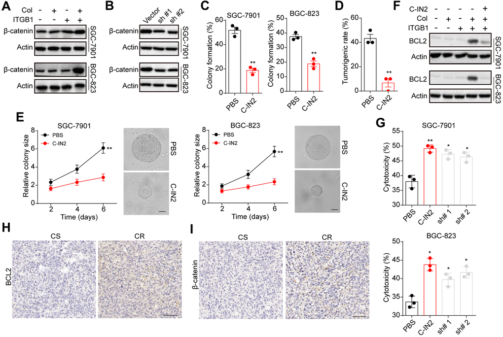Since Wnt/β-catenin served as the downstream signal of BCL9 [18, 19], we supposed that ITGB1 might upregulate BCL9L to mediate the activation of pro-survival β-catenin signals in gastric cancer. Here, we found enhanced expression of β-catenin in collagen cultured ITGB1 positive cells (Figure 4A). More importantly, suppression of BCL9L by sh RNA also suppressed the up-regulation of β-catenin in collagen cultured ITGB1 positive cells (Figure 4B), indicating that BCL9L mediated the activation of β-catenin signals in gastric cancer. Next, we used a β-catenin inhibitor β-catenin-IN2 (C-IN2) (Ann Marie Bode, et al. Inhibitors of beta-catenin in treatment of colorectal cancer. Patent US20150374662A1.) to treated collagen cultured ITGB1 positive cells. As a result, β-catenin inhibition obviously suppressed the 3D colony formation (Figure 4C) and tumorigenic rate (Figure 4D) of collagen cultured ITGB1 positive cells. The colony growth was inhibited by C-IN2 as well (Figure 4E). Subsequently, we examined the expression of anti-apoptotic protein BCL2, which have been reported to be up-regulated by β-catenin signals in tumor cells [20]. We found upregulation of BCL2 in collagen cultured ITGB1 positive cells, whereas suppression of β-catenin by C-IN2 suppressed BCL2 upregulation (Figure 4F). Subsequently, we suppressed β-catenin and BCL2 expression in collagen cultured ITGB1 positive cells, and then examined the cytotoxicity of 5-FU to gastric cancer cells. Consistently, suppression of β-catenin and BCL2 efficiently reversed the drugs resistance of collagen cultured ITGB1 positive cells (Figure 4G). And overexpression of BCL2 suppressed the effects of C-IN2 and strengthened the drugs resistance of collagen cultured ITGB1 positive cells (Supplementary Figure 1C, 1D). To further confirm the role of β-catenin and BCL2 in gastric resistance development, we examined the expression of β-catenin and BCL2 in tumor tissues from patients. Consistently, tumor tissues from CR gastric cancer patients revealed higher expression of BCL2 (Figure 4H) and β-catenin (Figure 4I). Those results suggested that BCL9L mediated activation of β-catenin/BCL2 signal pathway to regulate gastric cancer progression.