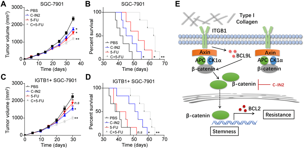 Our previous results have provided evidence that activation of β-catenin signals induced by collagen/ITGB1 could facilitate the chemotherapy resistance in gastric cancer. To improve the outcome of chemotherapeutic agents and suppress gastric cancer progression, it might be feasible to block β-catenin signals to improve the anticancer effects of chemotherapy. Here, we employed C-IN2 combing chemotherapeutic 5-FU to treat subcutaneous gastric tumor bearing mice model. Gastric tumor bearing mice models were constructed by subcutaneously injecting SGC-7901 cells into NOD-SCID mice. The tumor bearing mice were grouped randomly and received PBS, 5-FU monotherapy or combining with C-IN2 on day 14. After treatment of 2 weeks, we found that 5-FU or C-IN2 monotherapy could suppress the tumor growth slightly, whereas combination group revealed significant tumor suppressive effects (Figure 5A). Additionally, the mice in combination group exhibited obvious prolonged survival time compared to PBS or monotherapy groups (Figure 5B and Table 1), indicating that suppression of β-catenin signals strengthened the anticancer effects of chemotherapy. To further explore the anticancer effects of C-IN2 in ITGB1 positive gastric tumor tissues, we established subcutaneous gastric tumor bearing mice model by injecting 3D collagen cultured ITGB1 positive SGC-7901 cells into NOD-SCID mice, then mice were treated mice with PBS, 5-FU monotherapy or combining with C-IN2. Intriguingly, 5-FU monotherapy could not suppress the tumor growth or prolonged survival time of tumor bearing mice, which might be due to the drugs resistance induced by ITGB1. However, 5-FU combing C-IN2 revealed obvious anticancer effects (Figure 5C, 5D and Table 2). These results reminded that blockade of β-catenin signals to combine with chemotherapy could efficiently reverse the drugs resistance induced by ITGB1 and improved the anticancer effects, providing an innovative approach for gastric cancer therapy.