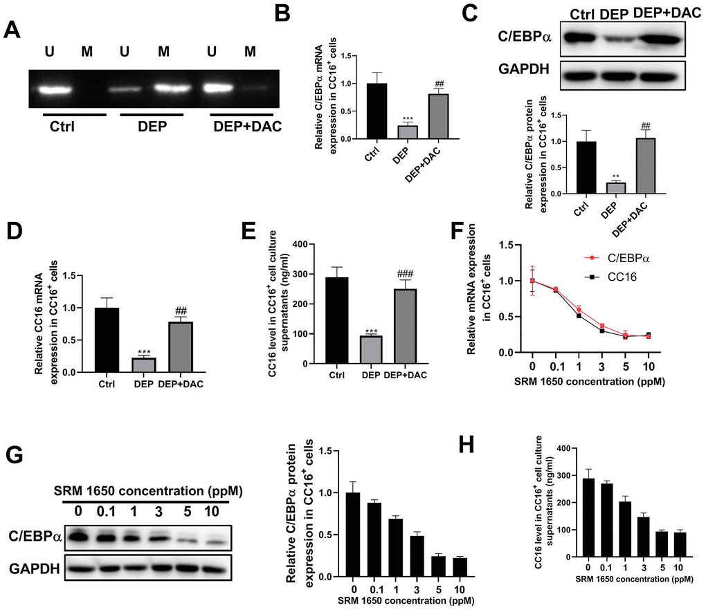 To assess whether DEP regulates CC16 production and secretion in CC16+ cells via induction of C/EBPα hypermethylation, CC16+ cells were treated with 5 ppm SRM 1650b (the National Institute of Standards and Technology, Gaithersburg, MD, USA) in the presence of DAC (Sigma-Aldrich) or not for 48 h. Then MSP, RT-PCR, western blot and ELISA were performed to detect the methylation of C/EBPα, the mRNA and protein expression of C/EBPα, CC16 mRNA expression, and CC16 level in culture supernatants, respectively. Additionally, we also determined the effects of treatment with other concentrations of SRM 1650b (0.1, 1, 3 and 10 ppm) on C/EBPα mRNA and protein expression, CC16 mRNA expression and level in culture supernatants.