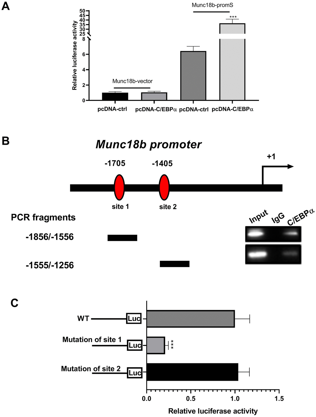 Given the above findings that the upstream of human Munc18b gene has two putative C/EBPα binding sites (-1705 and -1405 bp), and C/EBPα promotes Munc18b expression at the transcriptional level, we performed dual-luciferase reporter assay and chromatin immunoprecipitation (ChIP) assay to further investigate whether C/EBPα activates Munc18b transcription by directly binding to its putative promoter region. The luciferase activity was detected in CC16+ cells transfected with both Munc18b promoter construct (-2000/200; Munc18b-promS) or empty pGL3-basic vector (Munc18b-vector) and C/EBPα plasmid or its corresponding empty vector for 48 h. The results showed that Munc18b promoter construct led to an obvious increase in the relative luciferase activity, which was further reinforced by C/EBPα (Figure 4A). To identify the exact position where C/EBPα could bind within this fragment, a ChIP test was performed. As shown in Figure 4B, C/EBPα could bind to two putative binding sites, site 1 and site 2 sequences. Furthermore, to further clarify the function of site 1 and site 2, Munc18b promoter with wild-type (WT) or mutation of the binding motif 1 or 2, and C/EBPα plasmid were co-transfected into CC16+ cells. The results of the dual-luciferase reporter assay showed that in comparison with WT group, mutation of the binding motif 1 significantly inhibited the relative luciferase activity, and mutation of the binding motif 2 had no effect on the relative luciferase activity, suggesting that the site 1 was a functional site controlling Munc18b transcription (Figure 4C). These results indicated that C/EBPα activates Munc18b transcription by direct binding to the sites -1715/-1705 in Munc18b promoter.