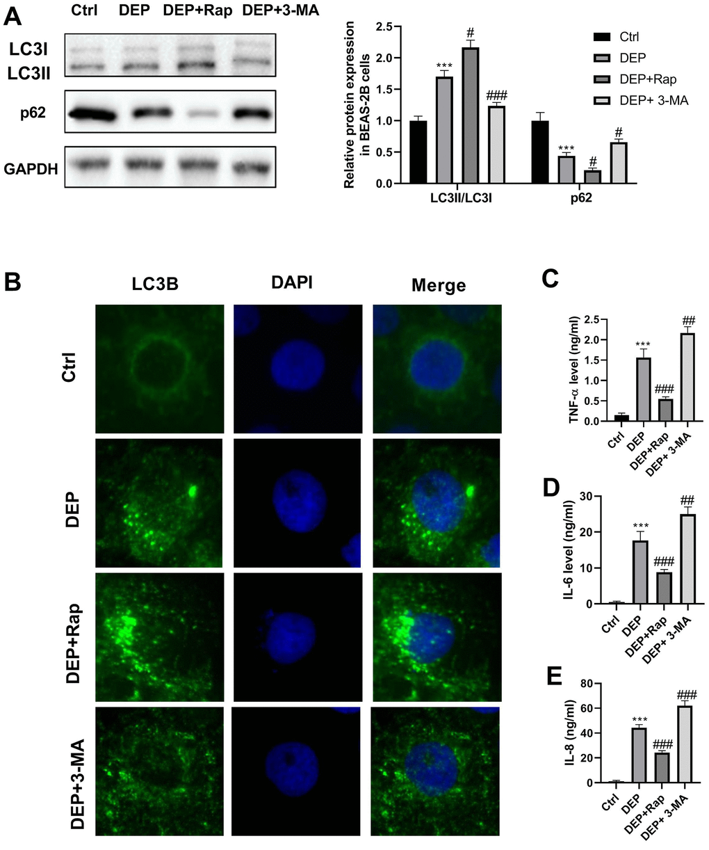 To investigate whether DEP induces bronchial epithelial cell inflammation via autophagy, BEAS-2B cells were pre-treated with 1.5 mM 3-MA (Sigma-Aldrich) or 10 nM Rap (Sigma-Aldrich) for 1 h, and then exposed to 5 ppm SRM 1650b for 12 h. Western blot, IF, and ELISA were then applied to detect the autophagy-related proteins LC3B and p62 expression, and pro-inflammatory cytokines TNF-a, IL-6, and IL-8 level in culture supernatants.