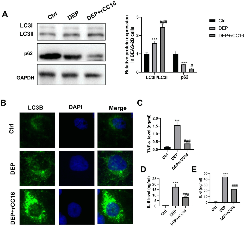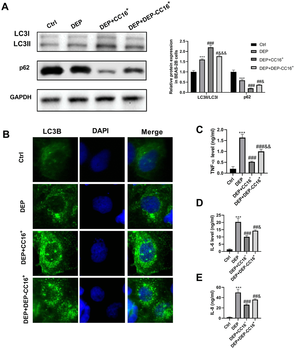 To investigate whether CC16 secretion from CC16+ cells protects against DEP-induced bronchial epithelial cell inflammation, BEAS-2B cells were divided into four groups and cultured with different medium for 12 h, including ctrl group (equiproportional mixing of fresh DMEM/F12 and HD-F12), DEP group (the same medium with ctrl group but containing 5 ppm SRM 1650b), DEP+CC16+ group (CC16+ medium containing 5 ppm SRM 1650b), and DEP+DEP-CC16+ group (DEP-CC16+ medium containing 5 ppm SRM 1650b). Next, the expression of p62 and LC3B protein, and the levels of TNF-a, IL-6, and IL-8 level were determined by western blot, IF, and ELISA, respectively.
