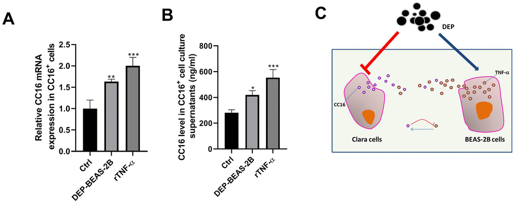 Herein, we aimed to investigate whether DEP inhibits CC16 secretion from Clara cells via C/EBPα-Munc18b axis, and CC16 and TNF-α form a negative feedback against DEP-induced bronchial epithelial cell inflammation.