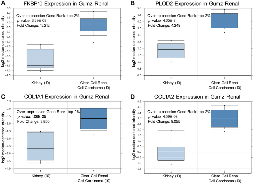 We compared transcriptional levels of FKBP10, PLOD2 and pro-collagen I chains in cancer tissues with normal samples by inquiring ONCOMINE database [14]. The mRNA expression level of FKBP10, PLOD2 and pro-collagen I chains was significantly upregulated in patients with ccRCC. In Gumz’s dataset [15], FKBP10 and PLOD2 were overexpressed compared with that in normal samples with a fold change of 13.212 and 4.249, both rank top 2% of over-expression genes (Figure 1A, 1B). For mRNA expression level of pro-collagen I chains in Gumz’s dataset, Collagen Type I Alpha 1 Chain (COL1A1) and Collagen Type I Alpha 2 Chain (COL1A2) showed fold changes of 3.850 and 9.055 respectively (Figure 1C, 1D). Indicating that not only mRNA of FKBP10 and PLOD2 but also pro-collagen I chains were aberrantly over-expressed.