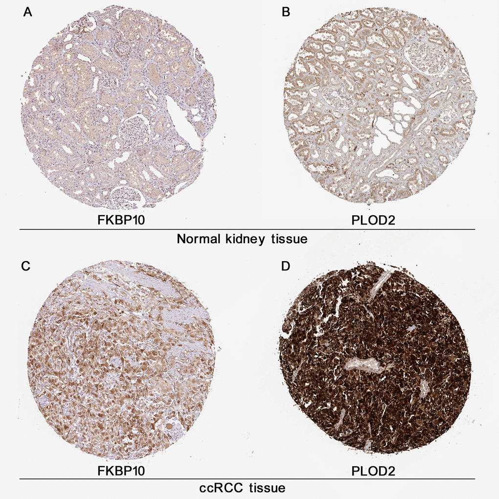 As shown in Figure 2, IHC data obtained from the public database HPA [16] gave us a direct visual result that FBP10 and PLOD2 displayed a strongly stained pattern in ccRCC tissues (Figure 2A, 2B), in contrast, normal kidney tissues have a relatively low level of FKBP10 and PLOD2 (Figure 2C, 2D).