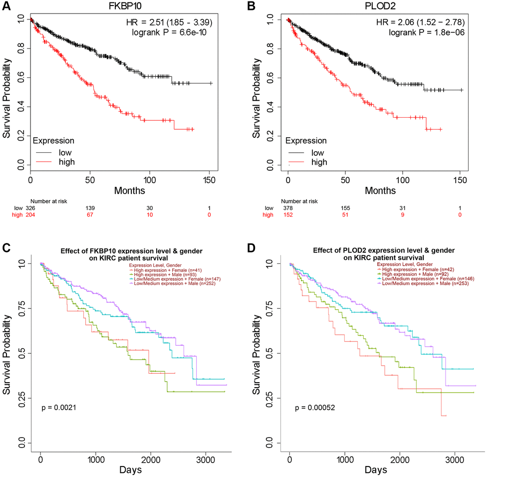 Next, we investigated prognosis data of FKBP10 and PLOD2 in ccRCC patients. Kaplan-Meier plotter [17] was employed in this section. As shown in Figure 3A and 3B, the Kaplan-Meier plotter calculated that higher mRNA expression of FKBP10 and PLOD2 were significantly associated with poor ccRCC patients’ Overall Survival (OS). Further survival analysis of different gender subgroups using UALCAN showed that regardless of different gender, patients with higher FKBP10 and PLOD2 mRNA expression levels presented shorter OS than those with lower levels (Figure 3C and 3D).