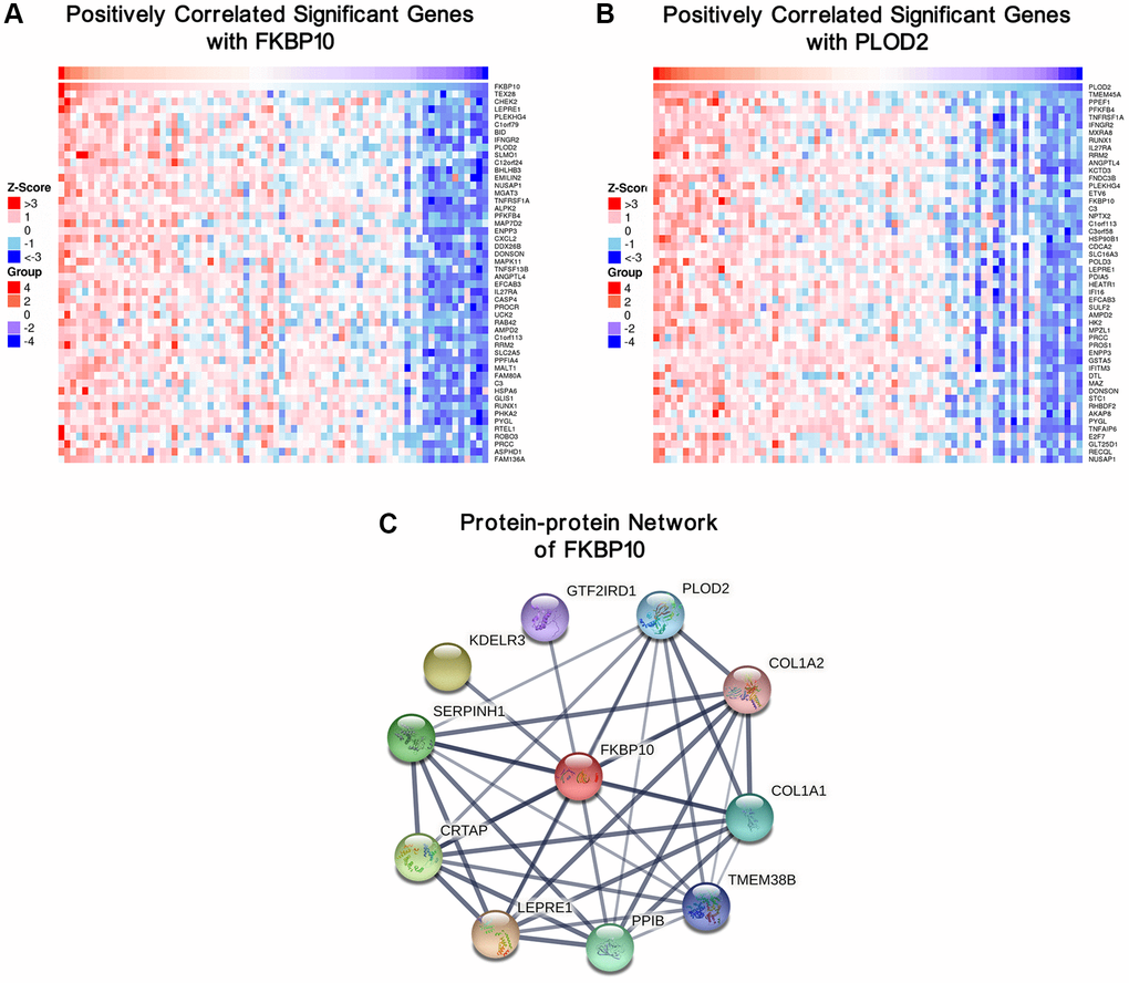 Top 50 positive genes correlated with FKBP10 and PLOD2 analyzed by LinkedOmics were presented as heatmaps. Both analyses of FKBP10 and PLOD2 share each other in top50 positively correlated genes (Figure 4A and 4B).