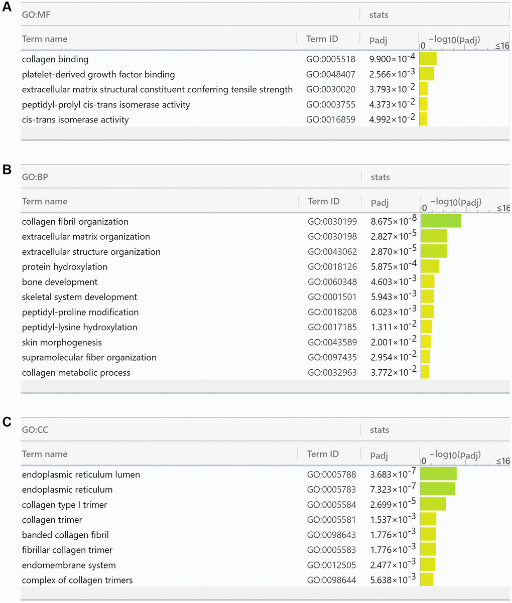 We then performed gene ontology analysis of FKBP10 and its correlated genes analyzed by String (FKBP10, LEPRE1, KDELR3, CRTAP, SERPINH1, PPIB, COL1A1, PLOD2, TMEM38B, GTF2IRD1, COL1A2) using the g:GOSt Functional profiling tab of g:Profiler [19]. The functional profiling results reported that the functional roles of the target gene list focus mainly on the aspect of collagen synthesis. The genes in the list are involved in Molecular Function: collagen binding (GO:0005518), extracellular matrix structural constituent conferring tensile strength (GO:0030020), cis-trans isomerase activity (GO:0016859) (Figure 5A); Biological Process: collagen fibril organization (GO:0030199), extracellular matrix organization (GO:0030198), peptidyl-proline modification (GO:0018208), peptidyl-lysine hydroxylation (GO:0017185), collagen metabolic process (GO:0032963) (Figure 5B); Cellular Component: endoplasmic reticulum lumen (GO:0005788), endoplasmic reticulum (GO:0005783), collagen type I trimer (G:0005584), collagen trimer (GO:0005581), fibrillar collagen trimer (GO:0005583), banded collagen fibril (GO:0098643), complex of collagen trimers (GO:0098644) (Figure 5C).