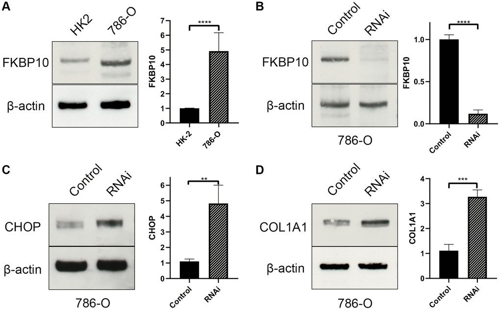 48 hours after RNAi transfection (Figure 6B), ccRCC cell line 786-O transfected with FKBP10 interference RNA was tested for pro-collagen I expression and ER stress. Not surprisingly, interference of FKBP10 deranged crosslinking of collagen type-I, causing pro-collagen I accumulation (Figure 6C). The accumulation of the pro-collagen brought about overexpression of ER stress marker CHOP (Figure 6D).
