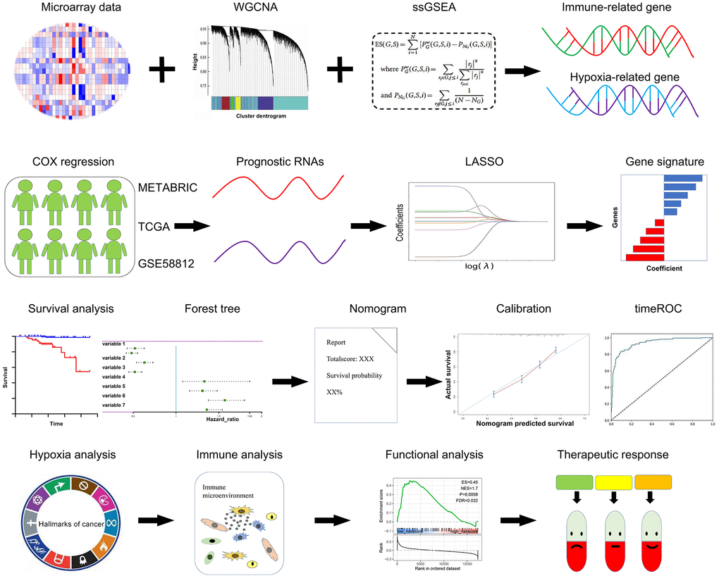 In this study, by performing a comprehensive bioinformatics analysis based on cross-public datasets, we aimed to establish and substantiate a combined hypoxia and immune-related gene signature to predict prognosis, risk stratification, and therapeutic response in TNBC patients.