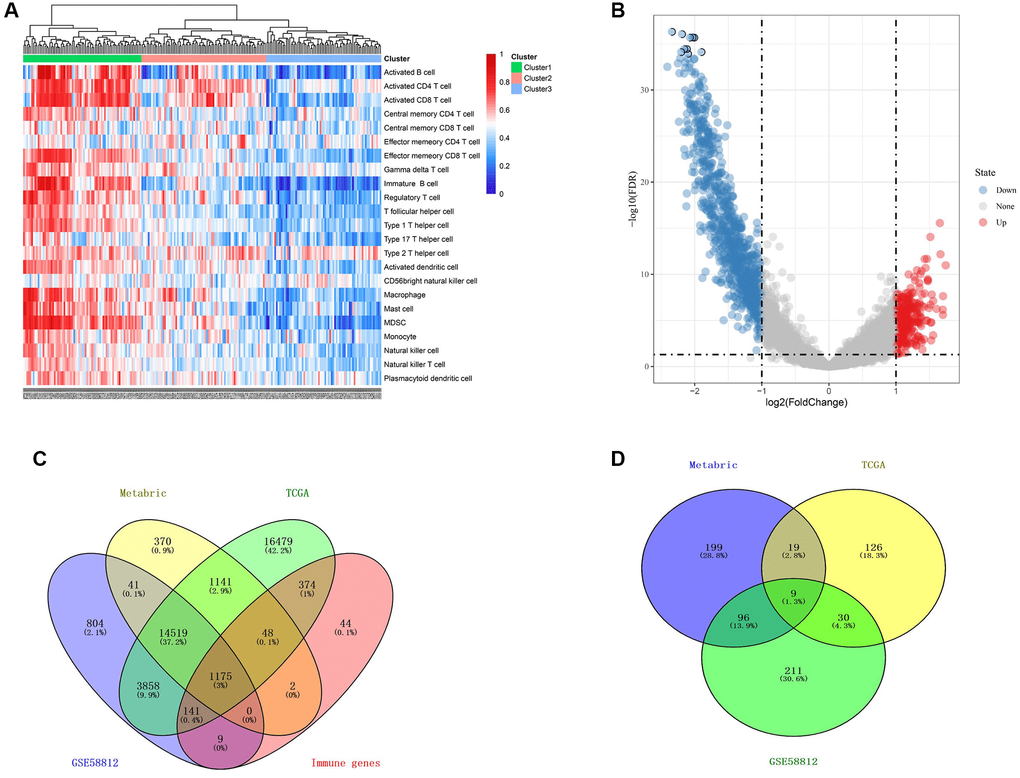 For the IRGs, 22 immune signatures were measured for their enrichment levels in respective TNBC cases by ssGSEA score [26, 27]. Patients were hierarchically clustered into three groups (high, median and low immune group) based on the ssGSEA score. Differential Expression Genes (DEGs) between high and low immune groups were identified by the “limma” package. Furthermore, genes with |log2 value (FC)| >1 and p < 0.05 after adjusting for FDR were considered as the immune-related DEGs. Finally, 1793 DEGs were identified from the above analyses.