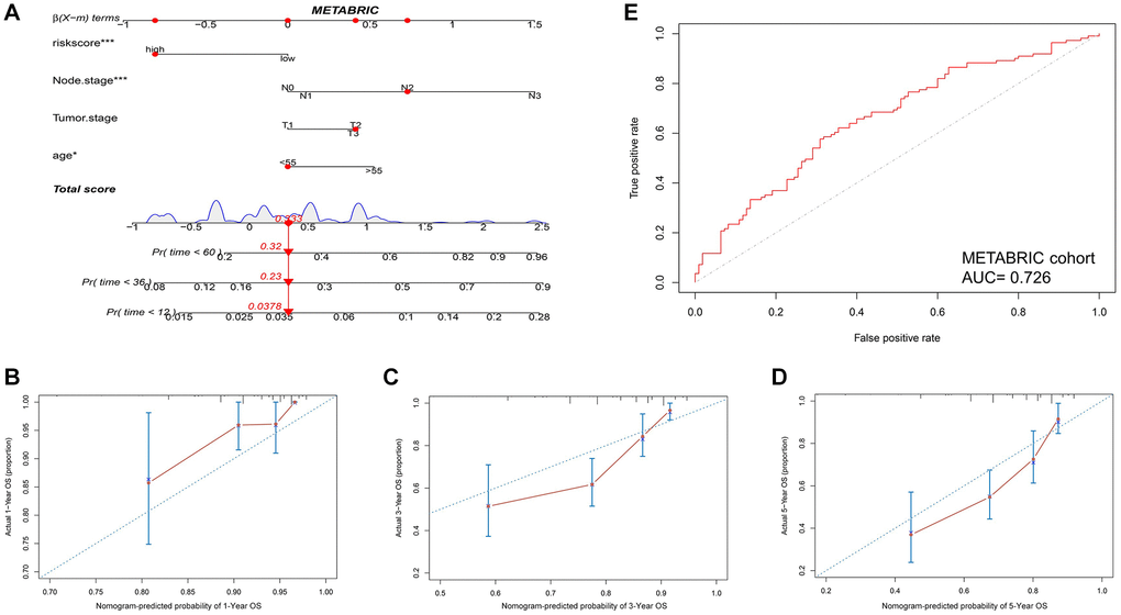 Then, a nomogram was constructed based on HIRS and other clinicopathological parameters in the METABRIC dataset to predict the survival for individual patients. As shown in Figure 5A, HIRS was an important predictor of OS in the visual model. Moreover, tROC and AUC were performed according to data availability (Figure 5B–5D and Supplementary Figure 4D–4F), the prediction accuracy of the nomogram for survival probability implied a promising predictive value of HIRS in the calibration analysis (Figure 5E and Supplementary Figure 4A–4C). Moreover, we analyzed the prediction accuracy of the nomogram in the GSE103091 cohort, the AUC values of the nomogram to predict 1-, 3- and 5-year MFS was 0.854, 0.759 and 0.711, respectively (Supplementary Figure 7A). The AUC values of the nomogram to predict 1-, 3- and 5-year OS was 0.860, 0.754 and 0.707, respectively (Supplementary Figure 7E). The calibration curves suggested that the nomogram-based predictive outcome had good consistency with the actual prognosis results (Supplementary Figure 7). The results revealed that the HIRS could be a promising marker for predicting clinical outcome in TNBC patients.