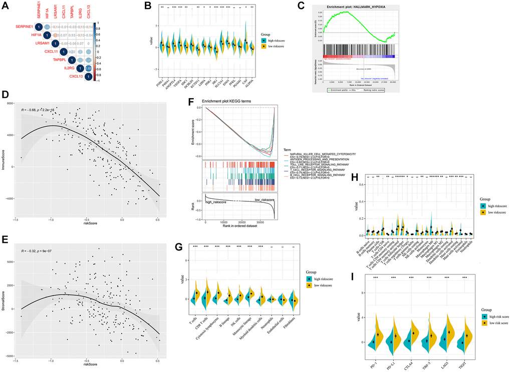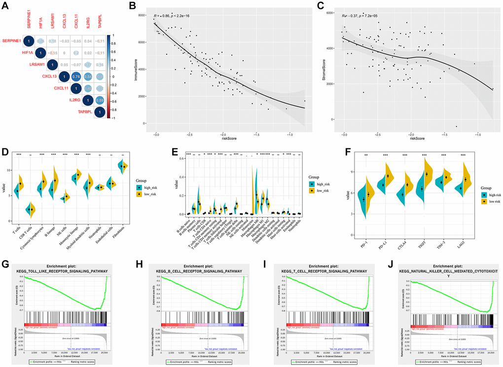 For the validation cohort, patients from GSE103091 were separated into different risk groups according to the median value of HIRS. Correlations of the gene signature with HIF1A expression were shown in Figure 8A. The immune and stromal scores were negatively associated with HIRS (Figure 8B, 8C). MCP-counter suggested that patients with lower HIRS value presented with a higher percentage of tumor-infiltrating cytotoxic immune cells (Figure 8D), and the CIBERSORT results showed that the high-risk group were qualified with more immune suppressive cells (Figure 8E). Meanwhile, patients with higher HIRS were exhibited significantly lower expression of PD-1, PD-L1, CTLA-4, LAG3, TIGIT, and TIM-3 comparative to those in the low- risk group (all P < 0.01) (Figure 8F). Furthermore, GSEA showed that immune related signaling were notably enriched in the high-risk group (Figure 8G–8J).