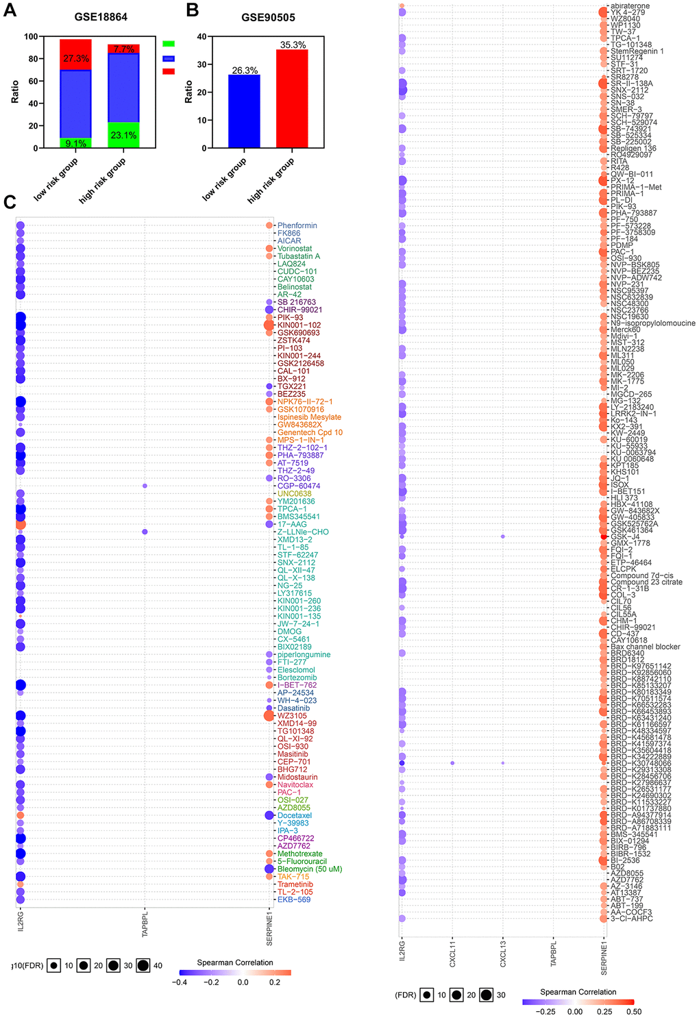 Considering tumor hypoxia and immune status always promote resistance to chemotherapy, whether the gene signature we constructed is a marker of therapeutic resistance needs further investigation. Patients from GSE90505 and GSE18864 were used to validate the prediction. As shown in Figure 7A–7B, the high risk group showed worse outcomes after chemotherapy in the GSE18864 and GSE90505 cohorts. Moreover, a landscape plot was explored by GSCALite to exhibit the relationship between drug reactions and the expression level of hypoxia-immune related genes (Figure 7C). The bubble heatmap depicted significant correlations between individual genes with IC50 data in BRCA cell lines. Thoroughly, SERPINE1 conferred drug resistance, while IL2RG exhibited drug sensitivity, which may help to explore targeted drugs to improve the clinical outcomes for TNBC patients.