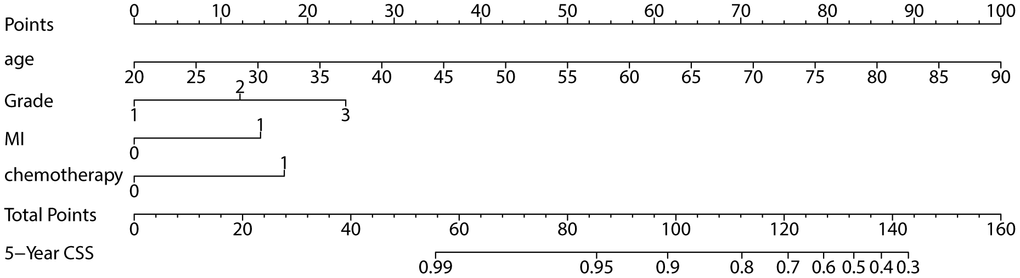 Age as a continuous variable was used in the multivariate analysis. The multivariate analysis showed that age, grade, MI and chemotherapy were independent prognostic factors for CSS (Table 3). The nomogram is shown in Figure 1. Older age, higher grade, MI≥1/2 and chemotherapy were high-risk factors for cancer-specific death.