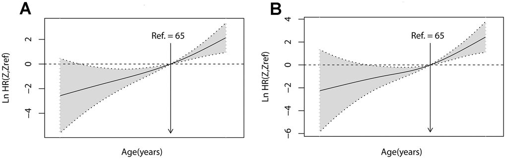 Therefore, age as a continuous variable for CSS is an independent prognostic factor, accounting for a large proportion of the prognostic risk. To quantify the prognostic effect of age, the patient's age was used as a continuous variable, and P-spline was used to enter Cox proportional hazards regression in smooth HR. The results showed that the risk (lnHR) of mortality increased steadily with age (Figure 2A). After adjusting for covariates (grade, MI, and chemotherapy), similar trends were found in the risk of death (lnHR) (Figure 2B).