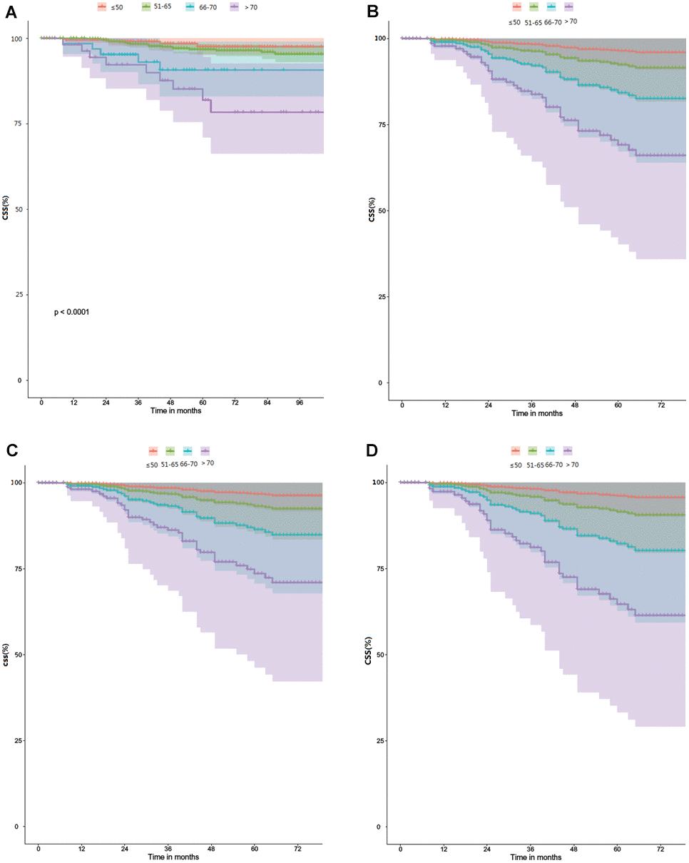 The survival analysis of each age group showed that the CSS of the oldest group was significantly lower than that of the younger group (P < 0.0001) (Figure 3A). After adjusting the covariates related to cancer characteristics, such as MI, LVSI, LUSI, CSI, grade and pathology, the difference in survival curves for each age group was more obvious (Figure 3B); after additional local treatment factors (surgical type and EBRT±VBT), the curve increased slightly(Figure 3C). After additional chemotherapy, CSS decreased significantly in the oldest group (Figure 3D). After adjusting for the above factors, the change of HRs in cancer-specific mortality at different age groups is shown in Table 5. The HRs of age on CSS in the patients >65y group were more than 4 times as high as that in the patients≤65y group in unadjusted model. After adjusting for the cancer characteristics, surgical type and EBRT±VBT covariates, the HR of age on CSS decreased from 5.516 to 4.618 and from 2.509 to 2.091 respectively for the patients over 70y group and the patients 66-70y group. But after adjusting for the above covariates plus additionally chemotherapy and treatment-related late toxicity covariates, the HR of age on CSS increased from 4.618 to 5.821 and decreased from 2.091 to 1.621 respectively for the patients over 70y group and the patients 66-70y group. There was no significant change in HRs between the two younger groups after adjustment.