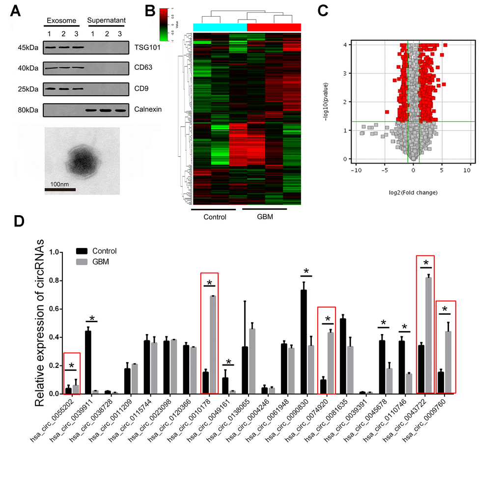 Exosomes are recently identified as one of the important components of cellular fluid, which are mainly secreted extracellular through cellular vesicles. Studies have shown that exosomes play an important mediating role in cell-to-cell cross-talk and substance exchange. In addition, a growing number of studies have shown that exosomes can also be used as a new molecular diagnostic marker, which plays an important role in the early diagnosis of diseases [14]. In addition, exosomes express major tissue phase endogenous molecules, such as capacitive complex (MHC) and CD63, and contain a large number of specific proteins and functional mRNAs, miRNAs, and even DNA. In addition, researchers also extracted abundant circRNAs from exosomes, and confirmed that the expression of circRNAs in exosomes and intracellular circRNAs was consistent [15]. In addition, previous studies also showed that there were significantly differentially expressed circRNA lineages in peripheral blood exosomes of some tumor patients, suggesting that it is possible to detect specific circRNA after peripheral blood exosomes were extracted, which may be used as molecular markers for the subsequent diagnosis or treatment of this disease [16, 17]. However, little evidence was investigated about the circRNA in the exosome of GBM patients.