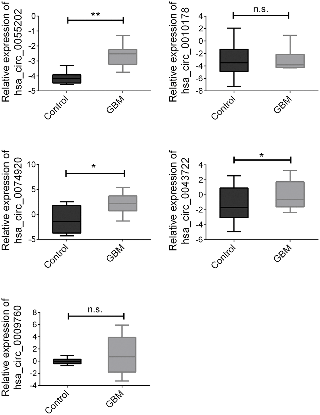 According to the data of the above training group, the rest 100 pairs of GBM and healthy control group samples were used for further verification. We detected the above circRNAs with upregulated expression and found that hsa_circ_0055202, hsa_circ_0074920 and hsa_circ_0043722 were still expressed in an elevated state in GBM. The expression of hsa_circ_0009760 was high in GBM, but there was no statistical difference. There was no significant difference in the expression of hsa_circ_0010178 (Figure 2).