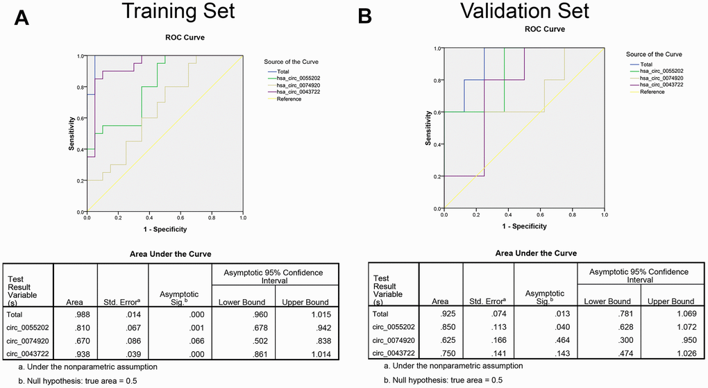 To further analyze the potential predicting ability of GBM from healthy controls. Receiver operating characteristic curve (ROC) was used to calculate the specific sensitivity and specificity. Firstly, the isolated circRNAs and three combined factors were analyzed in the training set (20 samples in each group as described above). As presented in Figure 3A, the areas under the curve (AUC) of hsa_circ_0055202, hsa_circ_0074920, hsa_circ_0043722 and combination of circRNAs (Merged) were 0.810, 0.670. 0.938 and 0.988, respectively. We continued the analysis using the same method in the validation group. As presented in Figure 3B, in validation group, the AUC of the four circRNAs and merged were 0.850, 0.625. 0.750 and 0.925, respectively.