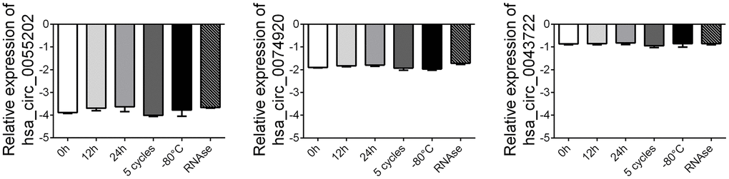 To further verify the stability of circRNA, we randomly selected 5 healthy control plasma samples and subjected the above samples to different treatments, including storage at -80° C for 7 days, storage at room temperature for 12 hours and 24 hours, repeated freeze-thaw treatment for 5 times and digestion with RNase enzyme. After different treatments, the exosome RNA was extracted and amplified by RT-PCR, and the changes of circRNA expression among the groups were compared. The results showed that the expression of circ_0055202, circ_0074920 and circ_0043722 did not significantly change after the above different treatments, suggesting that the expression of circ_0055202, circ_0074920 and circ_0043722 were relatively stable and detectable in plasma (Figure 4).