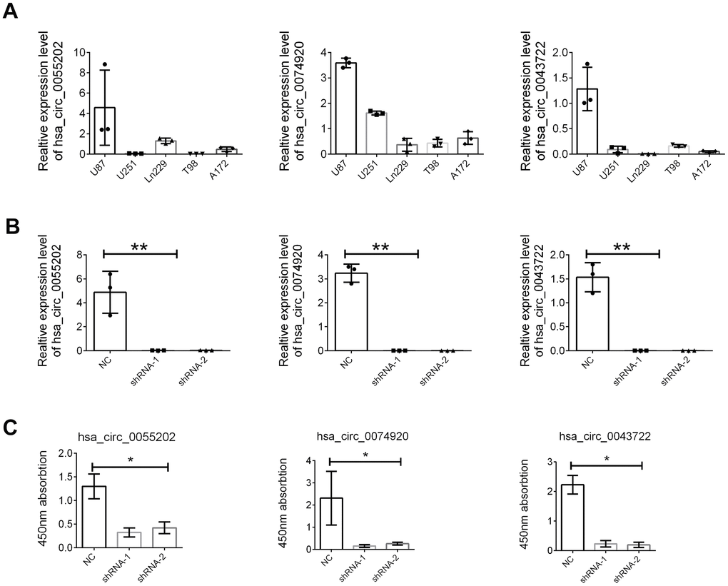 The detailed function of the three circRNA including circ_0055202, circ_0074920 and circ_0043722 were further investigated. Firstly, as presented in Figure 5A, the expression abundance of the there circRNA were examined in GBM cells including U87, U251, Ln229, T98, and A172. Based on this, we chose the U87 cells for further function assay with a relatively high abundance level. We knocked down the three circRNAs through the shRNA technology and confirmed the suppression of the three circRNA in U87 (Figure 5B). The CCK8 assay and transwell assay was employed. We found that either suppression of circ_0055202, circ_0074920 or circ_0043722 could reduce the proliferation of GBM cells (Figure 5C); however, no significance was found in cell invasion (Supplementary Figure 1).