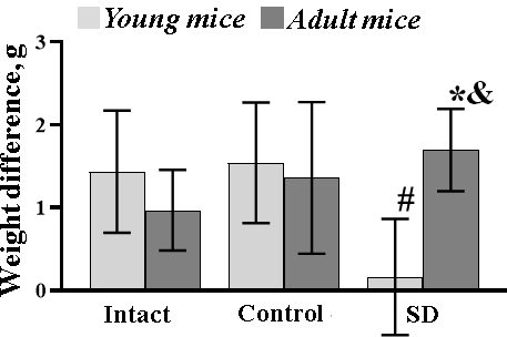 Moreover, the mice subjected to sleep deprivation gained increased exploratory activity. The mice of both aging groups left from the arena center and actively moved along its periphery. Of note, the young mice were more agile. The number of crossed squares in the arena periphery in the “SD young” and “SD adult” groups was 109.4±7.36 and 86.85±4.67, respectively. The young mice also had a more pronounced hole board exploratory behavior (number of peeks in holes: “SD young” 42.1±4.08, “SD adult” 32.04±1.85, p≤0.05). At the same time, the vertical motor activity was increased in adult mice compared to the young ones (the number of upright postures: “SD young” 4.3±1.0, “SD adult” 10.2±1.3, p≤0.05, Supplementary Table 1). An active search for an exit out of the arena points to an unstable emotional state and the increased anxiety level in mice. It can be assumed that such behavioral changes are associated with gradually cumulative response to long-term sleep deprivation and related to hyperactivity of the nervous system after chronic stress. Young mice respond to stress more actively, probably due to their increased adaptive capacity relative to the adult animals.