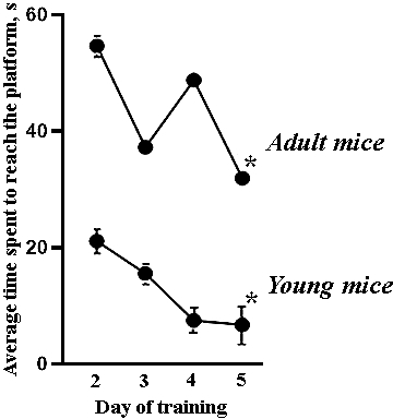 Our studies have shown that aging decreases the spatial learning abilities of female mice. During the training courses in the Morris water maze, the mice of 7-9 months of age spent significantly more time searching a platform, and the number of effective attempts to achieve the platform was lower compared to the 1.5 months mice (Figure 3). The young mice demonstrated fast positive dynamics of learning and predominantly used the direct searching strategy to find the platform by the end of the training course.