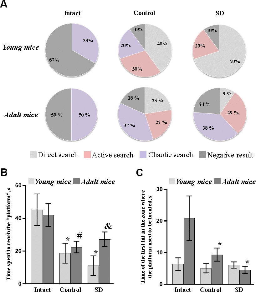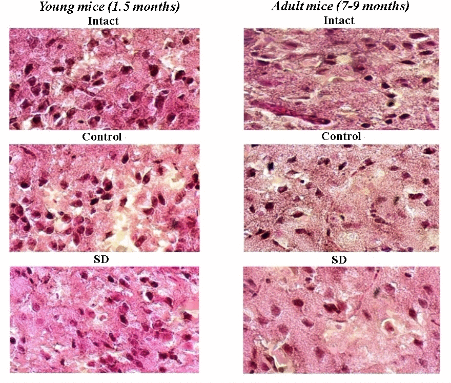 Female C57BL/6 mice were divided into the following groups: 1) Intact animals (n=13); 2) Control – the animals undergoing training in the Morris water maze without sleep deprivation modeling (n=32); 3) SD – the animals undergoing training in the Morris water maze followed by sleep deprivation modeling (n=32). Each group consisted of 1.5 (young) and 7-9 (adult) months mice.