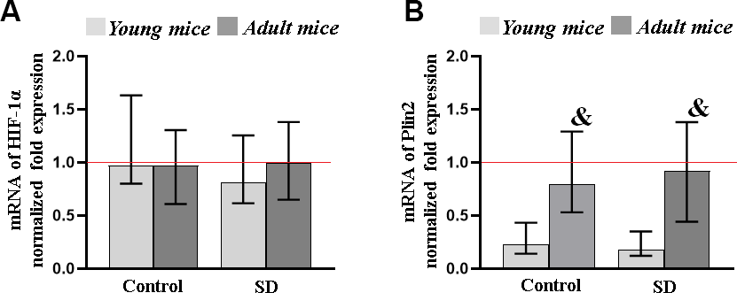 Next, using the RT-qPCR method, we analyzed the level of gene expression of α-subunit of hypoxia-inducible factor HIF1 (HIF1α) and perilipin 2 (PLIN2) in the mice brain after sleep deprivation modeling (Figure 6). HIF1α is one of the key participants that control oxygen homeostasis and adaptive processes in the brain under the influence of various stress-factors [55, 56]. PLIN2 is a protein involved in lipid storage and metabolism in non-adipose tissues which accumulation is regarded as a potential marker of age-related processes in the organism.