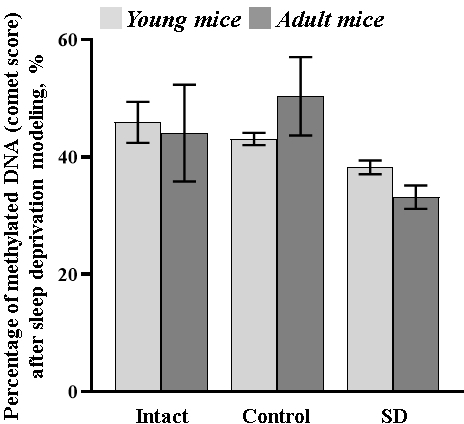 The data showed a downward tendency in the percentage of the methylated DNA in both young (comet score: “SD young” 38.22 ± 1.17%) and adult (comet score: “SD adult” 33.14 ± 1.99%) mice exposed to sleep deprivation modeling (Figure 7).