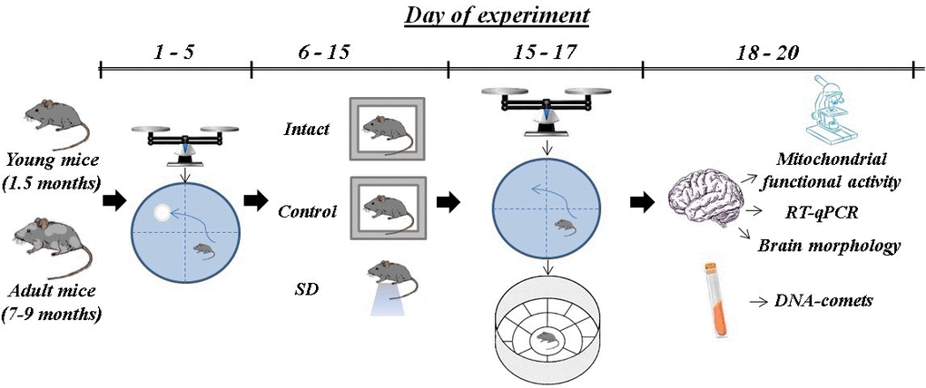 Aging is a complex process with no clear time frame for its beginning. One of the hallmarks of aging is changes in the appearance and development of cognitive impairments. In order to analyze whether sleep deprivation launching accelerated aging processes, in our study, we used female C57BL/6 mice at different stages of the postnatal period – 1.5 (young) and 7-9 (adult) months (Figure 1). The young mice are characterized by regular fur and clear sensory-motor functions. The older generation of mice already shows a loss of fur both on the body and muzzle up to 30-40%. The fur loses its luster and turns gray. The adult mice have also exceeded the weight of young specimens (1.5 months – 19.59±0.29 g; 7-9 months – 27.38±0.36 g) and had a lower locomotor and social activity that corresponds to the previously published data [29].