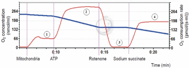 | Experimental groups | Basal of oxygen consumption rate (V4) | ADP-stimulated respiration (V3) | Inhibition of NADH dehydrogenase (inhibition of respiratory chain complex I) | Activation of an alternate pathway for the respiratory chain (activation of respiratory chain complex II) | Proton leakage | Mitochondrial activity in V3/V4 state |