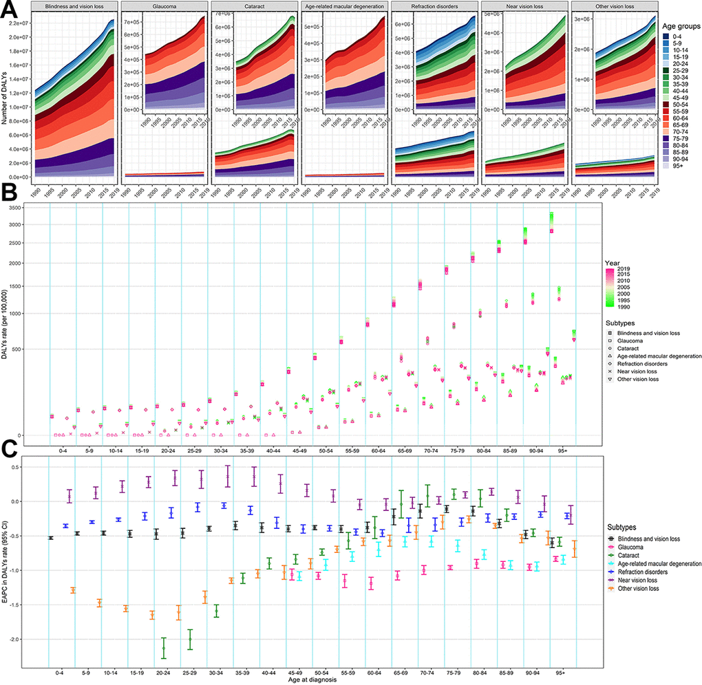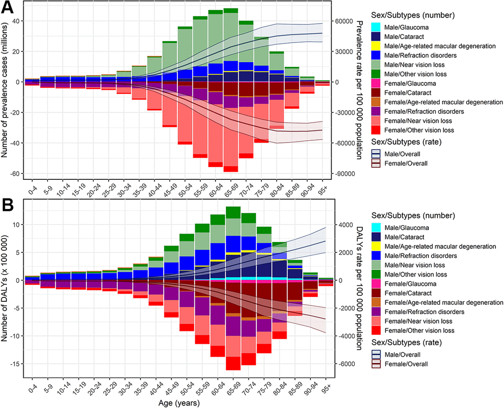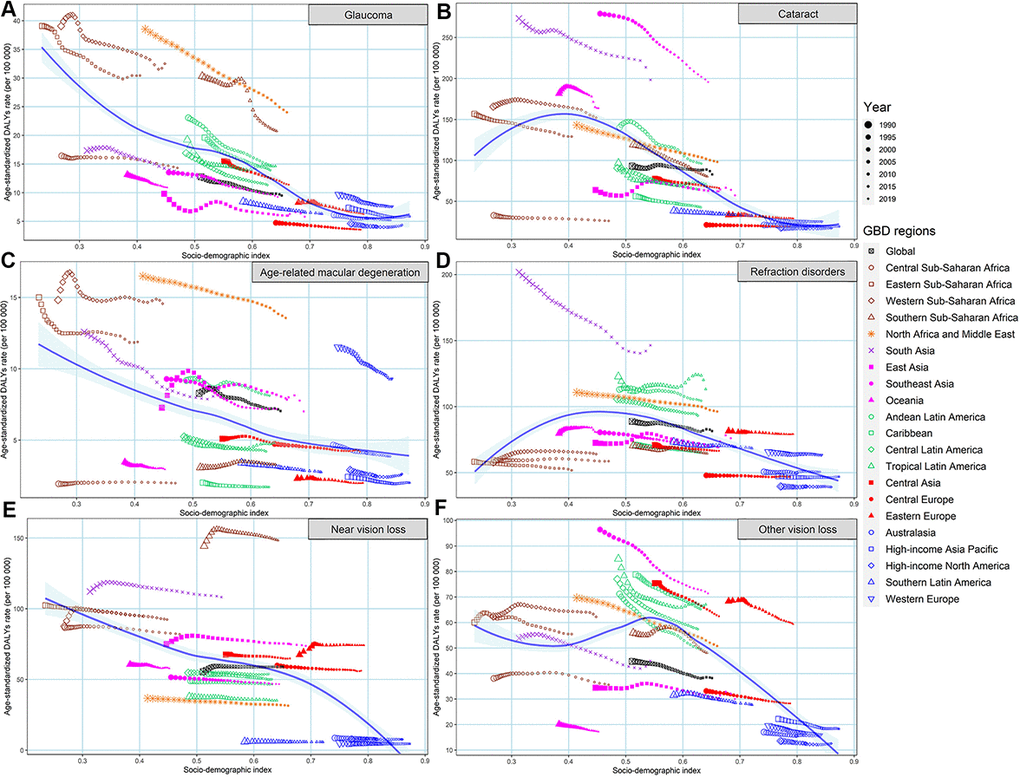 The latest global estimation and project on blindness and distance and near vision impairment among the population aged 50 years and older documents that about 43.3 million people worldwide suffer from blindness and 295 million people have moderate and severe vision impairment in 2020 [1]. Globally, an estimated 22.6 million disability-adjusted life years (DALYs) were caused by blindness and vision loss (BVL) in 2019, accounting for 0.88% of total DALYs due to all causes [2]. BVL brings severe personal educational and financial difficulties [3], reduces the quality of daily living [4], and increases mortality [5]. More than one-third of the patients with vision impairment could have not received effective prevention and treatment [6]. Understanding the global, regional and national characteristics as well as the temporal trends in specific causes of BVL is the essential basis for targeted public policy-making, such as medical resource allocation and health program planning.