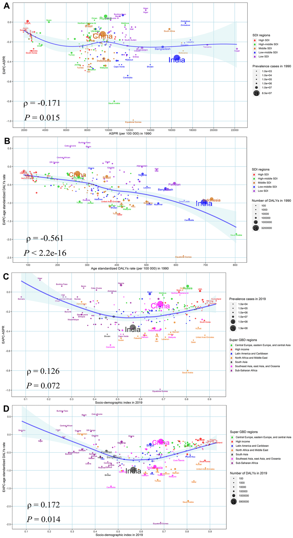 As shown in Figure 5, a significant negative association was detected between EAPC and age-standardized overall BVL burden rates in 1990 at the national level (ρ = -0.171, P = 0.015 for prevalence; ρ = -0.561, P < 2.2e-16 for DALYs), which reflected that the BVL burden might be given priority intervention in countries with a high burden rate. Although the positive relationship between EAPC in age-standardized burden rate and SDI in 2019 was significant, the obvious U shape relationship could be observed. Moreover, we investigated the correlation between SDI and age-standardized DALYs rate by specific eye diseases from 1990 to 2019 in 21 GBD regions around the world (Supplementary Figure 4 and Figure 6). The results indicated that the age-standardized DALYs rate was markedly negatively associated with SDI in GBD regions with SDI ranging from 0.4 to 0.7, especially for the burden in glaucoma, cataract, age-related macular degeneration and other vision loss.