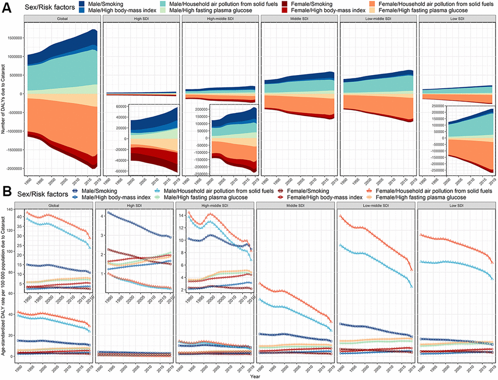 The top three eye diseases for DALYs due to BVL remained cataract, refractive disorders, and near vision loss over the past three decades. The DALYs due to cataract tended to be more prevalent in low or low-middle SDI regions, while it is promising that the age-standardized DALYs rates due to cataract in these regions have been decreasing over time, except for Burkina Faso, Chad, Afghanistan and Guinea, etc. The identified main contribution to cataract, namely, air pollution from solid fuels and smoking, dropped shapely across most countries, because the clean fuel for cooking has been popularized gradually with economic development and environmental requirement [8–10], and the prevalence of tobacco smoking further fell in more than 125 countries since 2003 under the WHO Framework Convention on Tobacco Control (FCTC) mobilization across the world [11, 12]. However, the age-standardized DALYs rates due to household air pollution from solid fuels in low SDI and low-middle regions still exceeded 74/100 000 over the past 30 years, especially in women, which was more than 300 times the burden in the high SDI region in 2019. A recent study from India reported that the application of clean cooking fuels such as kerosene or liquefied petroleum gas didn’t significantly increase with income growth, because the housework of cooking and fuel collection remains primarily women’s responsibility and gender inequality within the family determines low household investment in clean fuel in developing areas [13]. Promoting healthy lifestyles and eliminating gender inequality can alleviate the corresponding burden. Moreover, we noted that the age-standardized DALYs rate of cataract attributed to high body-mass index and high fasting plasma glucose elevated gradually across almost all SDI regions and even surpassed the contributor of smoking and air pollution from solid fuels in the high SDI region. Despite the improvement in prevention and treatment, cataract remains a major threat to eye health and accounts for one-third blindness [7, 14].