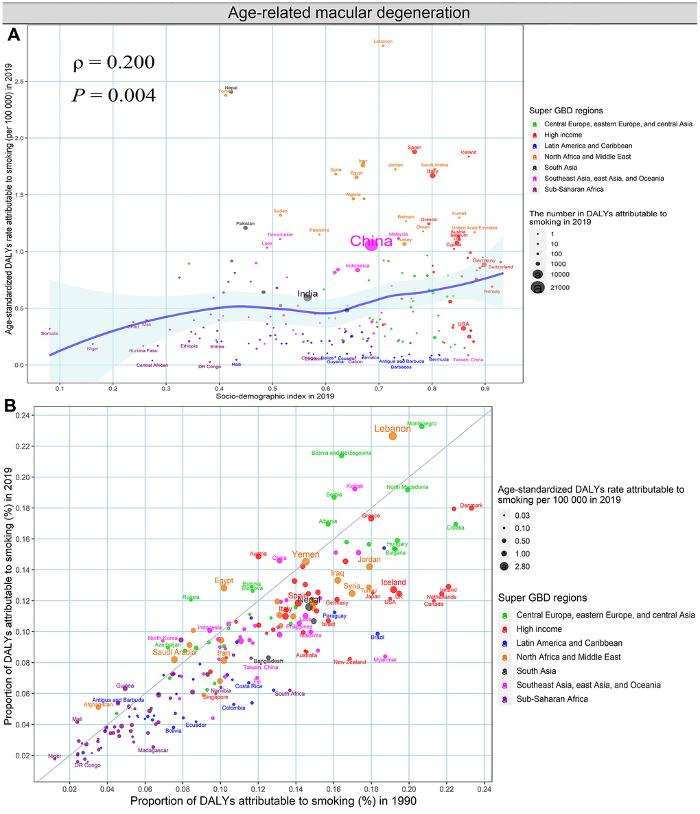 In addition, we found that the temporal trend in age-standardized DALYs rate due to BVL from 1990 to 2019, namely EAPC, was significantly negatively associated with baseline age-standardized rate. For those heavily burdened countries in 1990, the age-standardized DALYs rate of BVL was more likely to decline, which could be explained by the fact that countries with high burden are likely to take into account BVL and identified risk factors as a high priority in disease prevention and treatment schemes [41]. The annualized declined trend of age-standardized DALYs rates due to BVL was associated with the increasing SDI, except for the SDI areas exceeding 0.8 with a low burden in BVL. Possible reasons involve the highly public attention to BVL, intensive eye health education, the availability of clean cooking fuel, effective tobacco control intervention, access to visual examination, and improved vision correction and treatment [22, 42].