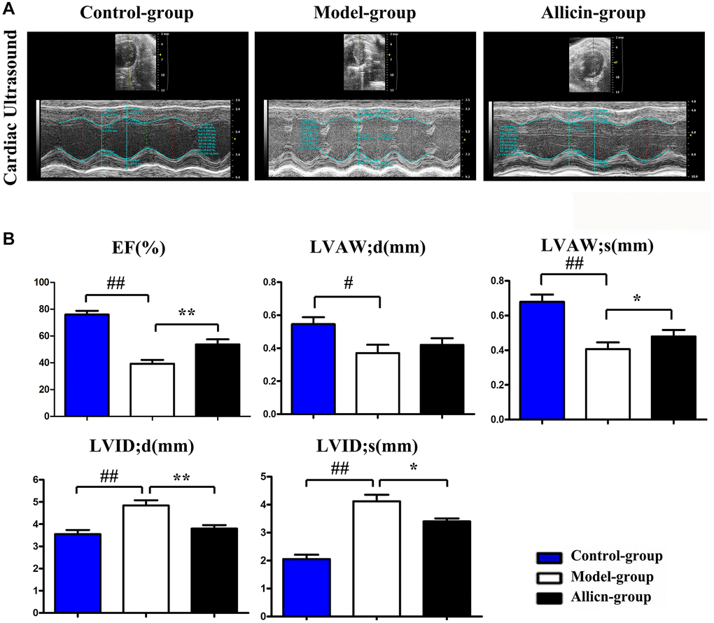 To examine the effects of allicin on myocardial IR injury in mice, we performed an ultrasound examination to evaluate the left ventricular wall thickness and cardiac function at day 24. Figure 1A demonstrated the two-dimensional B-mode high-resolution ultrasonographic imaging from different groups. Compared with the control group, LVEF, LVAW; d, and LVAW; s in the model group were lower, while the LVDI; d and LVID; s values were higher (all P < 0.05). In the allicin treatment group, allicin could elevate the decrease in LVEF, LVAW; d, and LVAW; s (Figure 1B); however, allicin merely exhibited statistically significant on LVEF and LVAW; s (allicin vs. model). Furthermore, allicin diminished the increase in LVDI; d and LVID; s compared with the model group (Figure 1B, P < 0.05). These results implied that allicin could improve cardiac function in mice after myocardial IR injury.