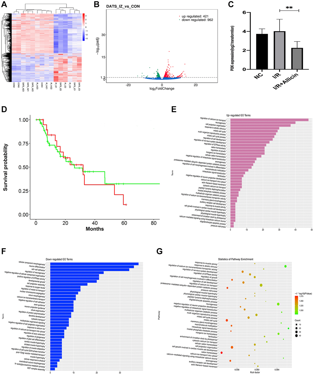 To clarify the mechanism of allicin-induced MI/R protection, we extracted RNA from NC, MI/R, and MI/R+ Allicin group to perform mRNA microarray analysis. As shown in Figure 3A, 203 up-regulated differentially expressed genes (DEGs) and 218 down-regulated DGEs were obtained using criteria of |logFC|>2, Padj<0.05 among the three groups, hierarchical clustering analysis exhibited an intense distinction on differentially expressed mRNAs in MI/R+ Allicin as indicated in the heat map. As shown in Figure 3B, a volcano plot was created to screen out the distribution of DEGs between MI/R+ Allicin and MI/R group. A gene named phosphatidylinositol-4; 5-bisphosphate 3-Kinase catalytic subunit alpha (PI3K) was down-regulated in the MI/R+ Allicin group was selected in our study. To further evaluate whether PI3KCA(PI3K) was downregulated in MI/R+ Allicin, we carried out qPCR to analyze the expression of PI3KCA(PI3K) in MI/R+ Allicin, NC, and MI/R tissues. The PI3KCA(PI3K) level was significantly decreased in MI/R+ Allicin tissues compared with I/R tissues. (Figure 3C, P < 0.05). Besides, we carried out the receiver operating characteristic (ROC) curve to evaluate the diagnostic value of the PI3KCA level. We found that the expression level of PI3KCA is associated with a higher overall survival rate, indicating PI3KCA might be an excellent diagnostic marker for MI/R injury (Figure 3D). As shown in Gene Ontology (GO) annotations in Figure 3E–3F, we found 39 upregulated pathways (Figure 3E), including regulation of calcium ion transport, calcium ion transport into the cytosol, cytosolic calcium ion transport, and peptidyl-tyrosine dephosphorylation. Furthermore, we also found 37 downregulated pathways (Figure 3F), including cellular component morphogenesis, neuron differentiation, and cell-cell adhesion. Similarly, partial results of the KEGG pathways were exhibited in Figure 3G. Considering the function and the frequency of the gene in the enriched pathway associated with MI/R injury, we finally chose PI3KCA (PI3K) and calcium ion transport signaling pathways for further investigation.