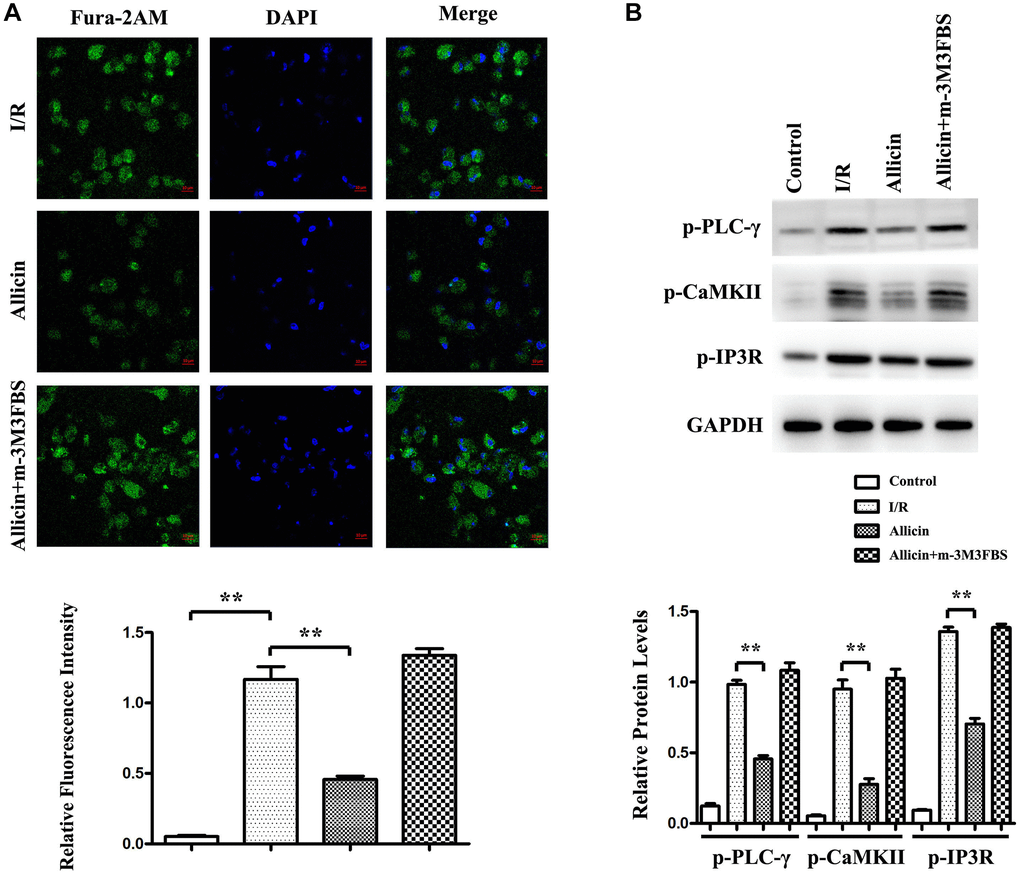 As we demonstrated that allicin repressed cardiomyocyte apoptosis and increased Ca2+ induced by GRK2/PLC/IP3R signaling pathway, we then examined the potential mechanism involved. A pan-PLC activator, m-3M3FBS, was injected into the culture medium of cardiomyocytes from the MI/R+ Allicin mice group. The cardiomyocytes from MI/R, MI/R+ Allicin, and MI/R+ Allicin+ m-3M3FBS were stained with Fura-2AM dye, showing allicin decreased intracellular Ca2+ increases after MI/R injury and the pan-PLC activator m-3M3FBS induced intracellular Ca2+ increases in MI/R. In western blot, we found that p-CaMKII, p-PLC-γ, and p-IP3R were increased in the MI/R group and reduced in the Allicin group m-3M3FBS could reverse the decrease of p-CaMKII, p-PLC-γ, and p-IP3R expression levels. These results suggested that the protective effect of allicin on MI/R injury by PI3K-mediated was via GRK2/PLC-γ/IP3R pathway.