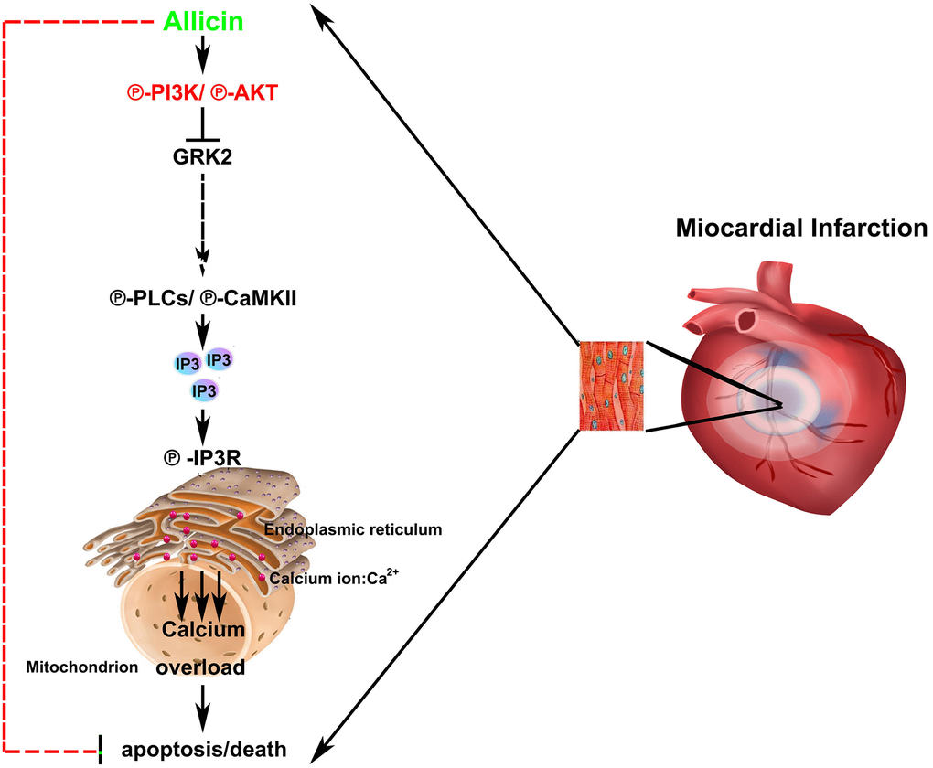 In summary, our present study extended these studies by a series of in vivo and in vitro experiments. As shown in Figure 7, it demonstrated for the first time that the protective effect of allicin against MI/R injury was related to the activation of PI3K, GRK2, PLC-γ, and Ca2+ overload and a consequent reduction in cardiomyocyte apoptosis. These findings might be significantly more to understand the molecular mechanisms of allicin on heart protection.
