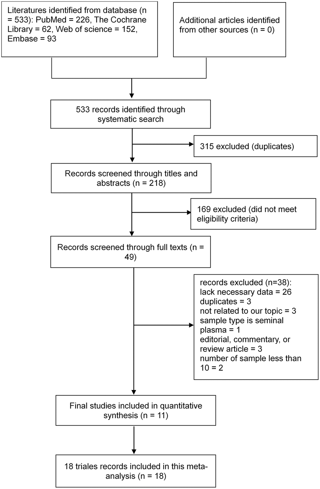The initial literature search yielded 533 potentially relevant studies. After removing 315 duplicate articles, we screened 218 articles, of which 49 were read. We finally selected 11 studies on 18 trials that met the eligibility criteria for further data extraction and analysis [29–39]. The literature search process is presented as a flowchart in Figure 1.