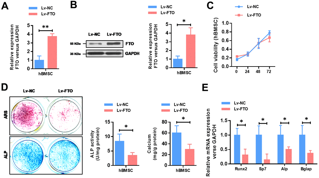To further explore the functional role of FTO in OP, we over-expressed the expression of FTO in hBMSCs. The efficiency of FTO overexpression in hBMSCs cells were confirmed by qRT-PCR (Figure 2A) as well as western blot (Figure 2B). Then, cell proliferation assay indicated that FTO over-expression did not affect the proliferation ability of hBMSCs (Figure 2C). To investigate its role in in osteogenesis of MSCs, osteogenic differentiation was conducted. Reduced activity of alkaline phosphatase staining (ALP), decreased calcium mineralization (Figure 2D), and down-regulated expression of osteogenic markers, including Runx2, Sp7, ALP, and Bglap (Figure 2E) indicated impaired osteogenic differentiation in FTO-overexpressed mesenchymal stem cells. These results indicated that FTO overexpression damaged osteogenic differentiation of BMSCs.