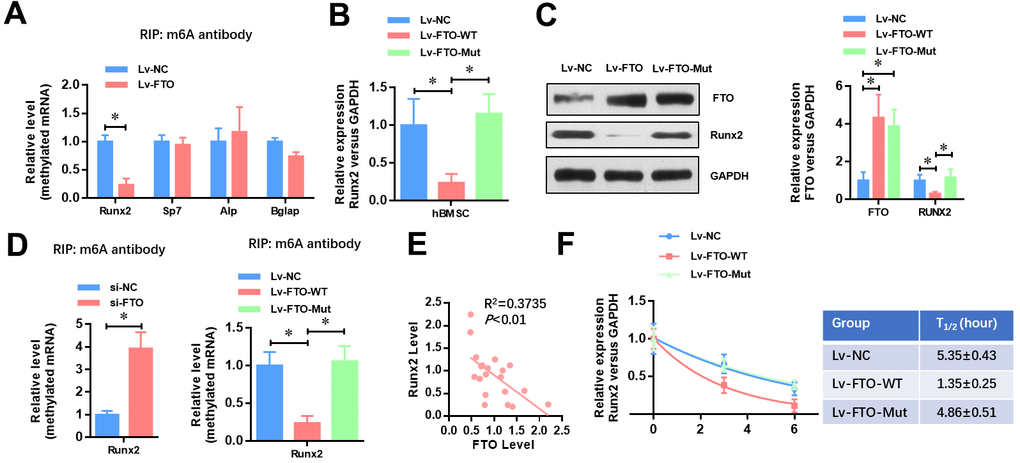 In conclusion, our results demonstrate that RNA N6-methyladenosine demethylase FTO promotes osteoporosis through demethylating Runx2 mRNA and inhibiting osteogenic differentiation. These findings indicate that FTO mediated demethylation of Runx2 may be a potential target for treatment of OP.