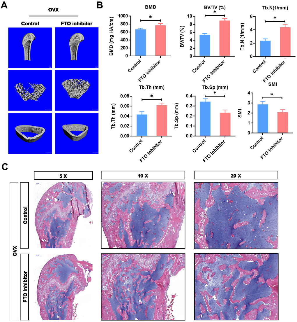 To investigate the critical function of FTO in vivo, we used the OVX animal model. As shown in Figure 4A, the BMD and BV/TV detected by μCT analysis were significantly increased in FTO inhibited OVX mice. In addition, FTO inhibition also increased the Tb.N and Tb.Th, while decreasing the Tb.Sp and SMI. Furthermore, the histological evaluation suggested that the overall area of stained bone from the FTO inhibited OVX group was significantly up-regulated compared with those in the normal OVX group, which suggests that the impaired development of new bone was reversed by FTO inhibition. Collectively, these results indicate that therapeutic inhibition of FTO may able to counteract the bone loss in osteoporosis.